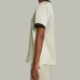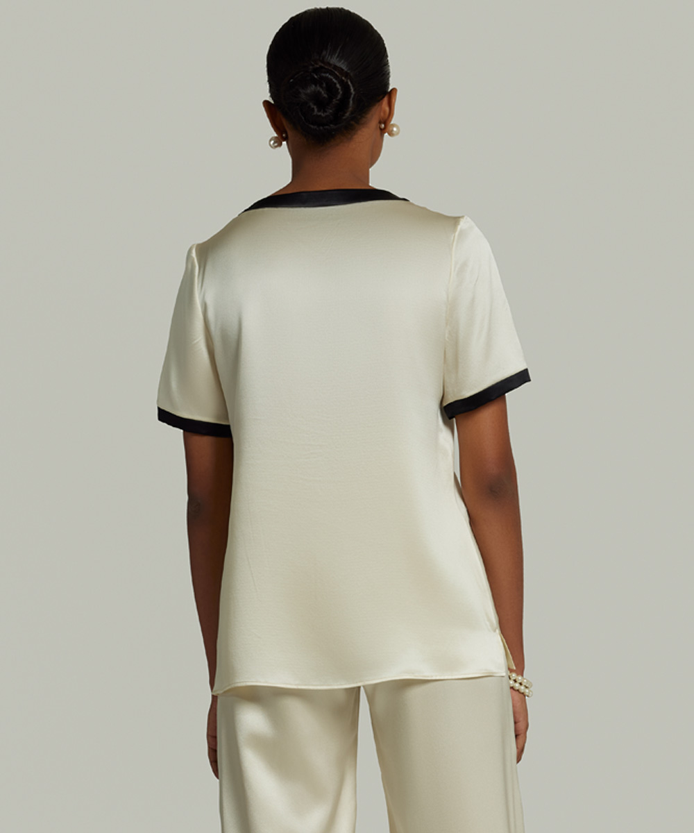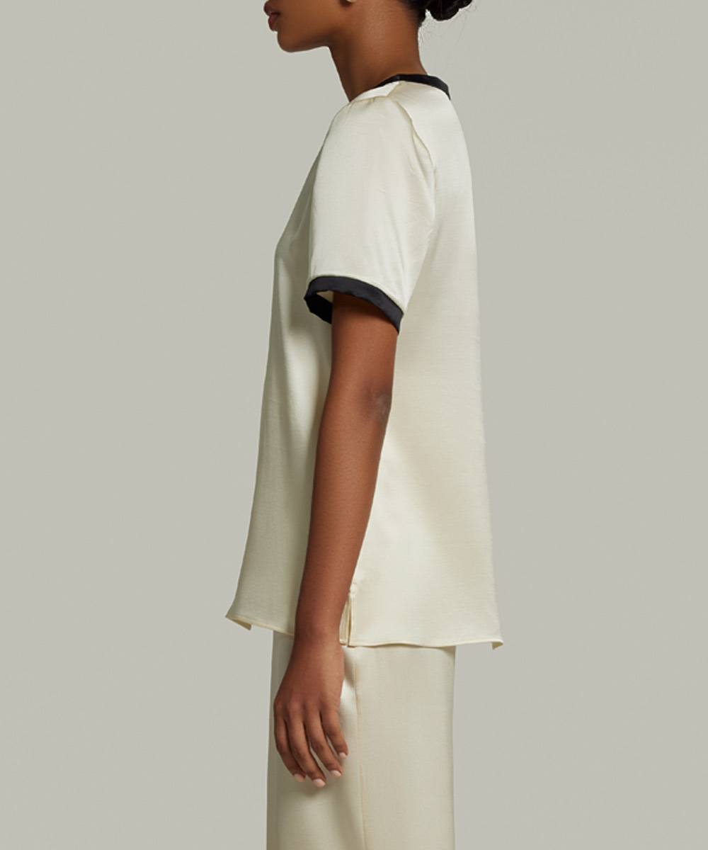 - T-shirt in cream with contrast neckline and cuff piping detail in black