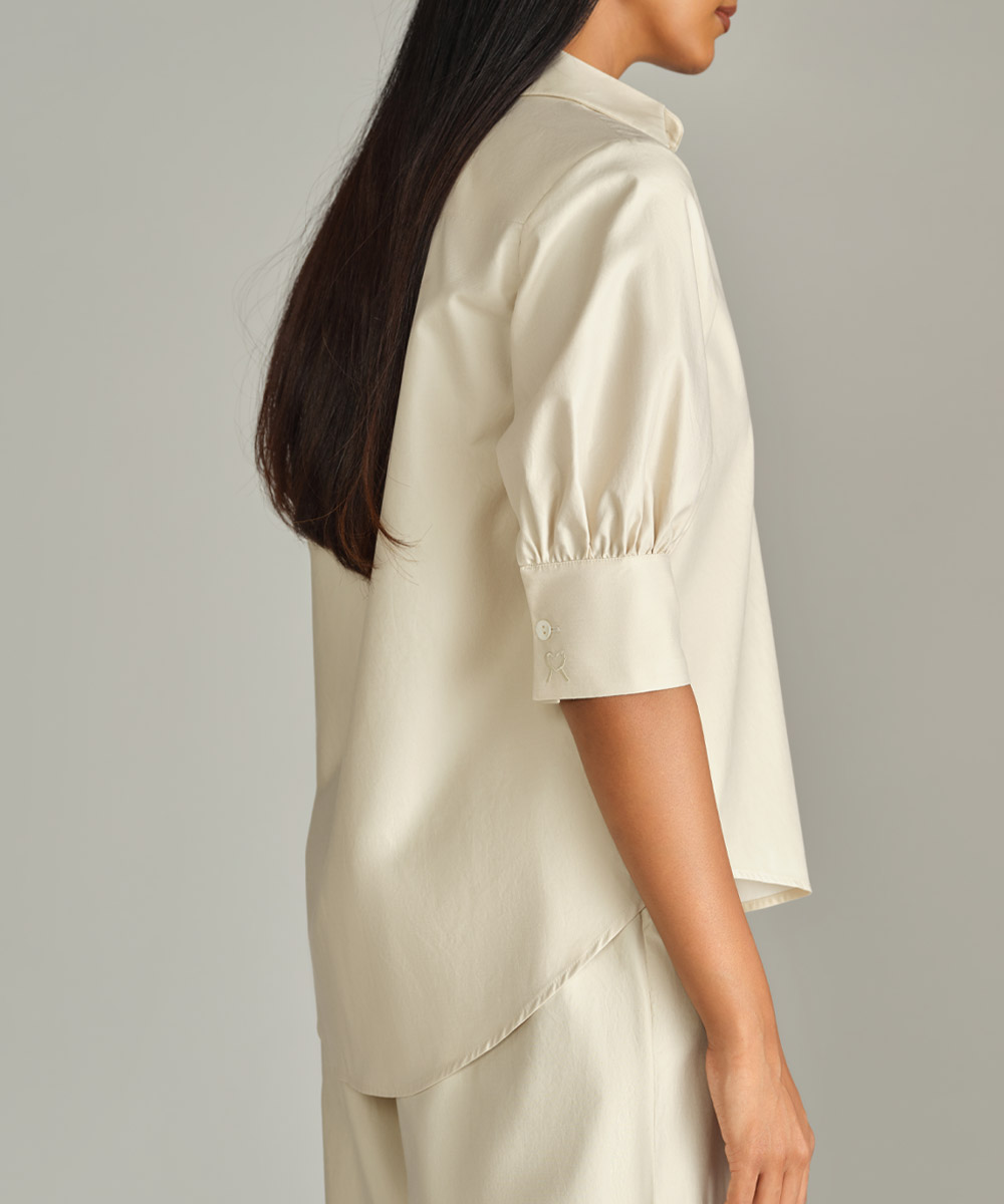 - Elbow length sleeves with pleats at cuff